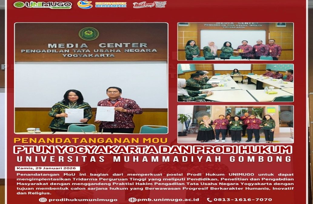Yogyakarta, Kamis (29/01/2026) – Program Studi Hukum Universitas Muhammadiyah Gombong (UNIMUGO) resmi menjalin kerja sama dengan Pengadilan Tata Usaha Negara (PTUN) Yogyakarta melalui penandatanganan Memorandum of Understanding (MoU) yang dilaksanakan di Media Center PTUN Yogyakarta.